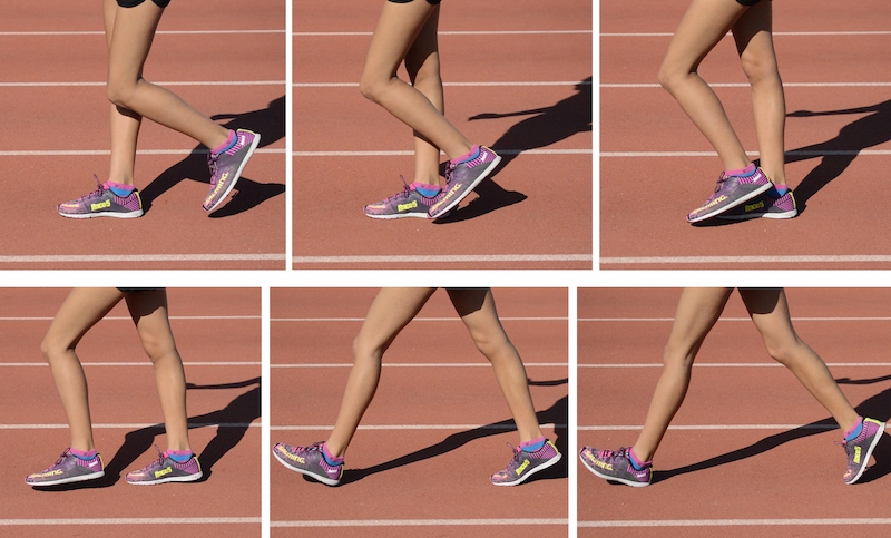 Seguimos con la acción de rodillas, la cuál va a continuación del movimiento de pies. Las rodillas deben ir completamente extendidas durante la acción de la pierna de apoyo, hasta pasar la vertical del cuerpo. La pierna que está sin apoyo, hará un balanceo hacia delante para así comenzar de nuevo con un ciclo, pudiendo doblar ligeramente la rodilla para facilitar esta acción.