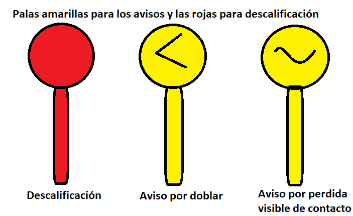 En la carrera hay varios jueces, los cuales sacarán una especie de tarjetas pero en este caso son paletas. Estas pueden ser amarillas y rojas, las rojas son las que si se te acumulan tres, te expulsan de la carrera.